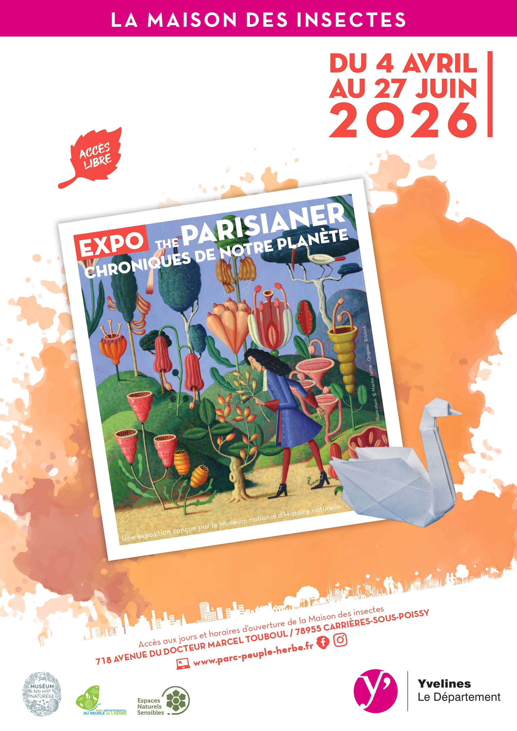 Fort de son partenariat avec le Muséum national d’Histoire naturelle en place depuis 2021, le Département des Yvelines accueille, une nouvelle fois cette année, une exposition originale de cette grande institution au sein de la Maison des insectes. Embarquez pour un voyage dans le temps, au cœur de l'histoire naturelle de notre planète, à travers les couvertures illustrées d'un magazine fictif "The Parisianer".